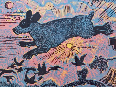 I mistakenly assumed the land of hex signs and furrowed fields would inspire hard-edged geometric abstraction and minimalism. Not so here, though, making me think that artists who see minimalism in their everyday lives might just as likely aspire to the expressionistic art you see around you tonight, such as Robert Patierno’s colorful, celebratory relief print of a dog leaping through the sky at sunset, or Linda Mylin Ross’s dark and mysterious “Patio at 10 p.m. II.” Even Ted Rasmussen’s carved wood “Centerpiece,” the most ostensibly minimal of the works here, stands out more for its sensuous surface than its simple circular shape.