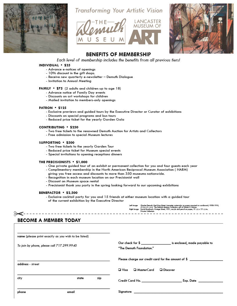 Why join the Museum? The Lancaster Museum of Art is a vital visual arts resource in the Lancaster Community and the surrounding region. We are committed to making sure that we are accessible to all by maintaining an admission-free facility. Our members help us stay that way. In addition, members are an important part of what makes our galleries vibrant and relevant – your support ensures that we continue to bring the “best available art” to Lancaster. Thank you!